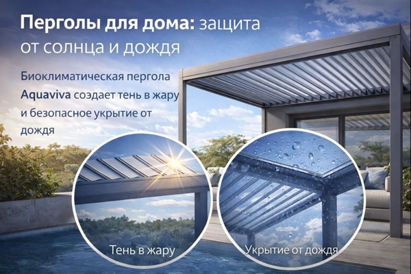 В этом контексте пергола Aquaviva может рассматриваться как пример конструктивного решения, при котором в жаркую погоду обеспечивается необходимая тень и защита от прямых солнечных лучей, что способствует сохранению прохлады и комфорта на террасе.